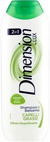 Dimension By Lux Shampoo & Balsamo 2In1 Capelli Grassi Effetto Riequilibrante 250 Ml: Dimension by Lux ha una linea di shampoo arricchita con un concentrato di estratti naturalmente presenti nella frutta: glucosio, vitamine C ed E, acido delicato della frutta. Lo shampoo nutre il capello dalla radice, dona forza e corposità e rende la superficie del capello più liscia per una migliore lucentezza. Giorno dopo giorno i tuoi capelli saranno forti e splendenti, pieni di salute.