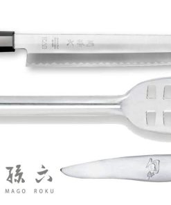 La lama affusolata e molto lunga consente infatti di lavorare il pesce con tagli netti e precisi tipici degli chef giapponesi, l’impugnatura dalla forma ottagonale è composto da una combinazione di resina e legno che lo rende resistente al calore e all’umidità.