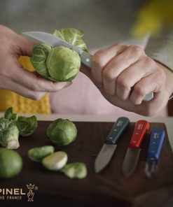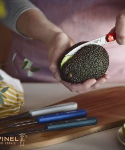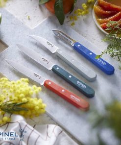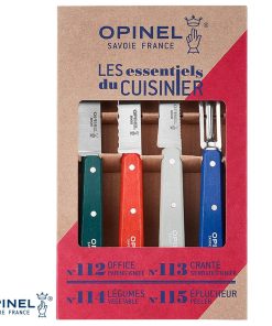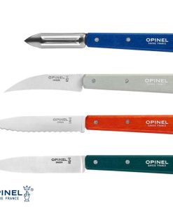 Nuovo set colorato Opinel composto da 4 coltelli essenziali in cucina: un coltello multiuso con lama liscia, un coltello con lama seghettata, uno spelucchino curvo e un pelapatate.